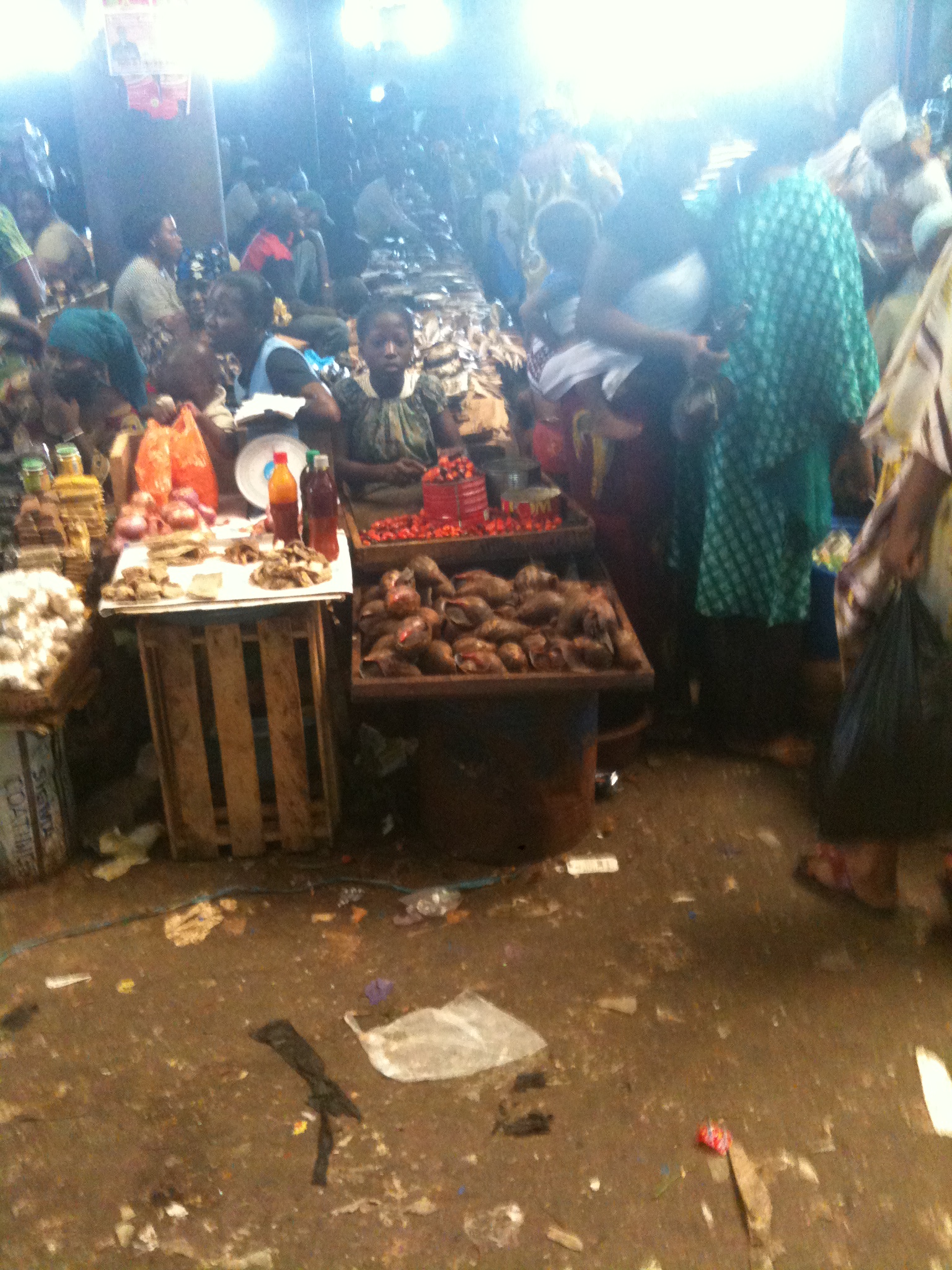 Am Nachmittag ging es dann mit der ganzen Crew auf Stadttour. Es war wieder mal eindrücklich, wie gut entwickelt dieses Abidjan im Vergleich zu anderen Städten Afrikas ist. Wir waren im Gebiet mit den Botschaften und dem Präsidentenpalast, auf einem Markt mit Schnecken und Hühnern und Schweinebeinen (Bilder unten), und einer Kathedrale. Diese war im Vergleich zu den Europäischen eigentlich noch ganz schlicht. Dafür war eine der Fensterbilder eine groteske Darstellung der Missionskolonisation. Ich frag mich, wer in einer Kirche in den Gottesdienst geht, in der er jedes mal sehen muss, wie die weissen Engeln den armen Schwarzen endlich das Paradies bringen, während sie selber doch schon halb im Paradies leben. Tja, ich weiss, ich vermische jetzt so ziemlich alles zwischen Imperialismus und berechtigter Evangelisation.